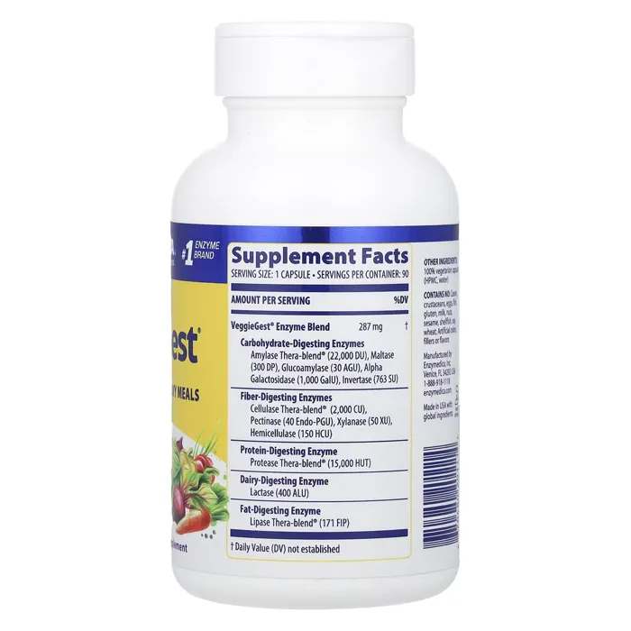 این قرص ضد نفخ فوری گیاهی حاوی آنزیمهای طبیعی است که به تجزیه کربوهیدراتهای پیچیده موجود در حبوبات، سبزیجات و غلات کمک میکند. با افزایش توانایی بدن در هضم این مواد غذایی، میتوانید از مزایای سلامتی آنها بهرهمند شوید.ترکیب منحصر به فرد Thera-blend در VeggieGest شامل آنزیمهایی است که به طور خاص برای تجزیه پروتئینها، چربیها و کربوهیدراتها طراحی شدهاند. این آنزیمها به بدن کمک میکنند تا مواد مغذی را بهتر جذب کند و از عوارض جانبی ناشی از هضم نادرست جلوگیری نمایند. همچنین، این مکمل کمک درمانی فاقد هرگونه مواد افزودنی مضر، آلرژنها و رنگهای مصنوعی است که آن را برای مصرف روزانه ایمن میسازد.