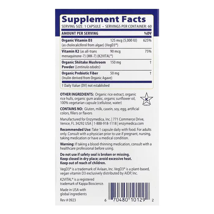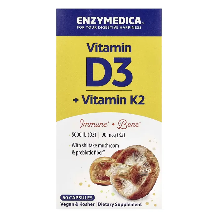 قارچ شیتاکه نیز دارای خواص آنتیاکسیدانی و ضد التهابی است که به تقویت سیستم ایمنی کمک میکند. فیبر پریبیوتیک موجود در این مکمل نیز به تغذیه باکتریهای مفید روده کمک کرده و سلامت گوارش را تقویت میکند.مکمل ویتامین D3 + ویتامین K2 از برند Enzymedica یک محصول گیاهی و غیر اعتیادآور است که با هدف حمایت از سیستم ایمنی و سلامت استخوانها طراحی شده است. این مکمل شامل ترکیبات طبیعی مؤثر است که به تسهیل فرآیند جذب کلسیم و بهبود وضعیت گوارش کمک میکنند.